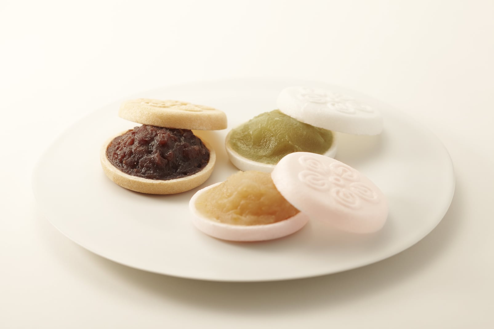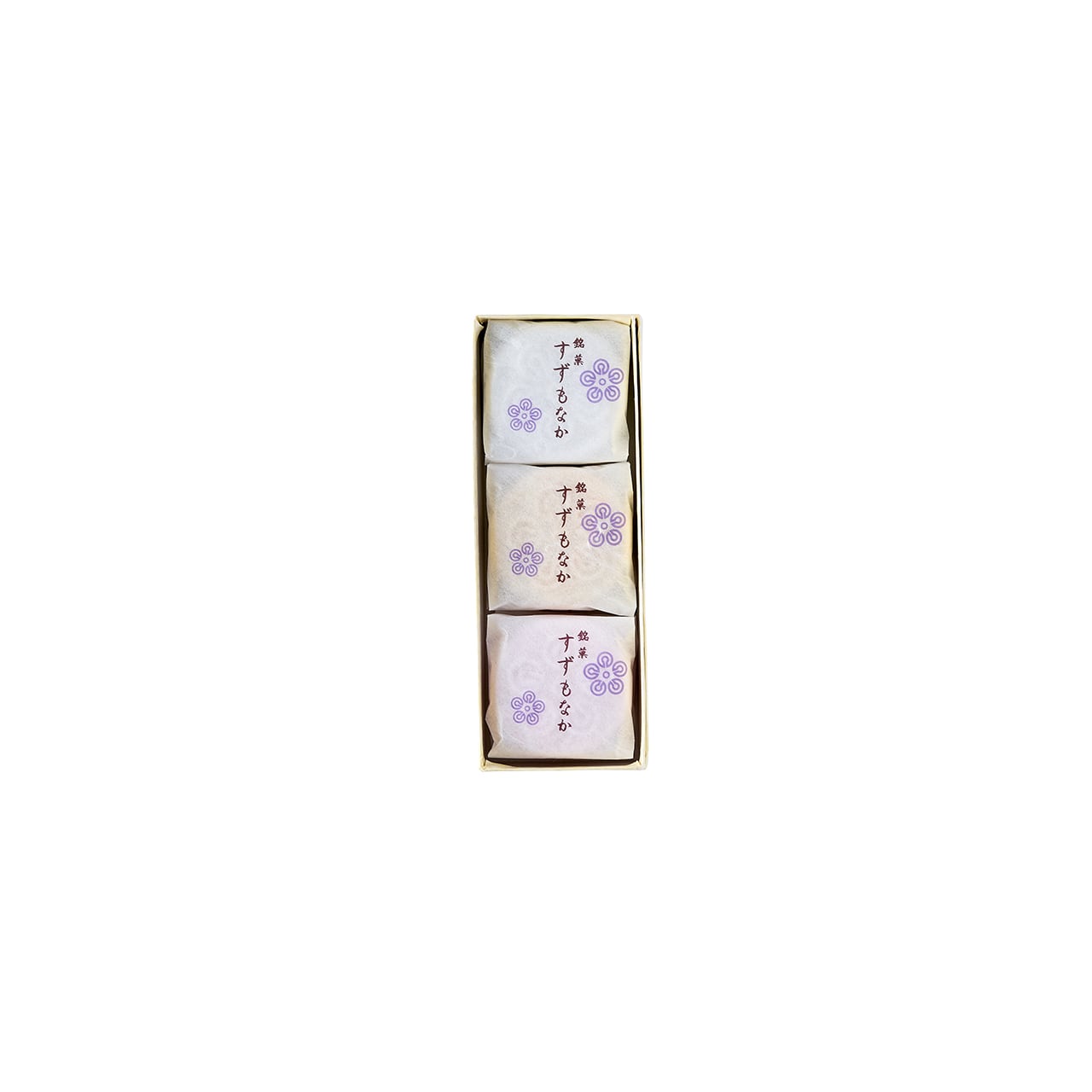 鈴の形をしたかわいらしい最中で、3種類の餡は、大納言(茶)・柚子(白)・栗(ピンク)。大納言は、北海道は大納言を時間をかけてゆっくり炊いたつぶし餡。柚子餡は、白餡に柚子皮をすって入れた上品な風味です。